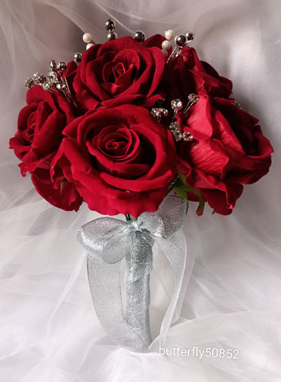 ورد قطيفة أحمر مع فروع ألماظ و شريط لامع